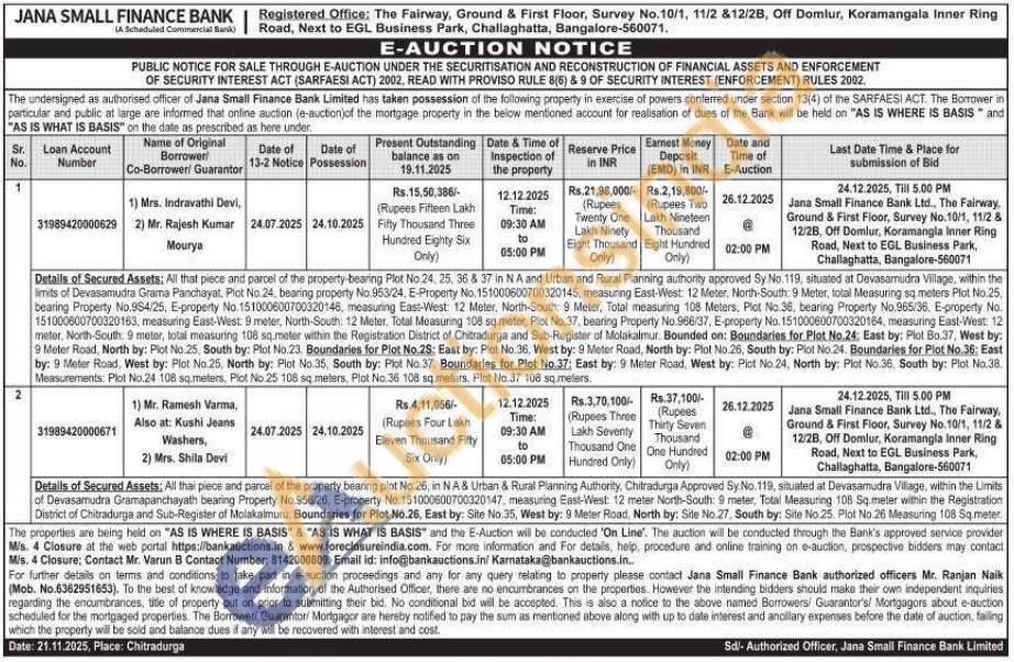 Details of Secured Assets: All that piece and parcel of the property-bearing Plot No 24, 25, 36 & 37 in N A and Urban and Rural Planning authority approved Sy No. 119, situated at Devasamudra Village, within the limits of Devasamudra Grama Panchayat, Plot No 24, bearing property No.953/24, E-Property No. 151000600700320145, measunng East-West: 12 Meter, North-South: 9 Meter, total Measuring sq meters Plot No.25. bearing Property No.984/25, E-property No. 151000600700320148, measuring East-West: 12 Meter, North-South: 9 Meter, Total measuring 108 Meters, Plot No.36, bearing Property No.965/36, E-property No. 151000600700320163, measuring East-West: 9 meter, North-South: 12 Meter, Total Measuring 108 sq.meter, Plot No.37, bearing Property No.966/37, E-property No. 151000600700320164, measuring East-West: 12 meter, North-South. 9 meter, total measuring 108 sq.meter within the Registration District of Chitradurga and Sub-Register of Molakalmur. Bounded on: Boundaries for Plot No.24: East by: Plot Bo.37, West by: 9 Meter Road, North by: Plot No.25, South by: Plol No.23. Boundaries for Plot No.2S: East by: Plot No.36, West by: 9 Meter Road, North by: Plot No.26, South by: Plot No.24. Boundaries for Plot No. 36: East by: 9 Meter Road, West by: Plot No.25, North by: Plot No.35, South by: Plot No 37. Boundaries for Plot No.37; East by: 9 Meter Road, West by: Plot No.24, North by: Plot No.36, South by: Plot No.38. Measurements: Plot No.24 108 sq.meters, Plot No 25 108 sq meters. Plot No.36 108 sq meters, Plot No.37 108 sq melers