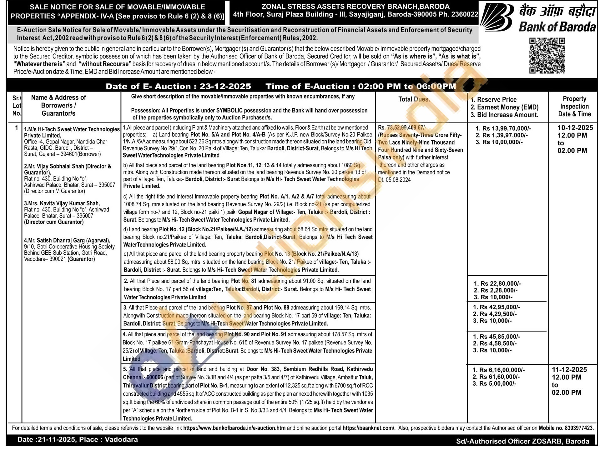 3. All that Piece and parcel of the land bearing Plot No. 87 and Plot No. 88 admeasuring about 169.14 Sq. mtrs. Alongwith Construction made thereon situated on the land bearing Block No. 17 part 59 of village: Ten, Taluka: Bardoli, District: Surat. Belongs to M/s Hi-Tech Sweet Water Technologies Private Limited