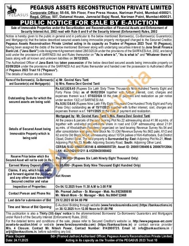 All the pieces & parcels of the land bearing Plot No.22 admeasuring about 41.98 sq.mtrs. of together with undivided proportionate share in road and COP admeasuring about 21.91 sq.mtrs. of Khodaidham Residency organized on land bearing Revenue Survey No.54 and after consolidation was given New Block No.13 (Old Revenue Survey No.56/2 paiki, 61/2 and 62 and its Old Block No.54) admeasuring about 10724 paikee of Kim-Kathodara, Sub District Olpad, District Surat. The said property is Surrounded by: East: Adjoining Plot No.21, West: Adjoining Plot No.23, North: Adjoining Society Road, South: Adjoining Other Land.