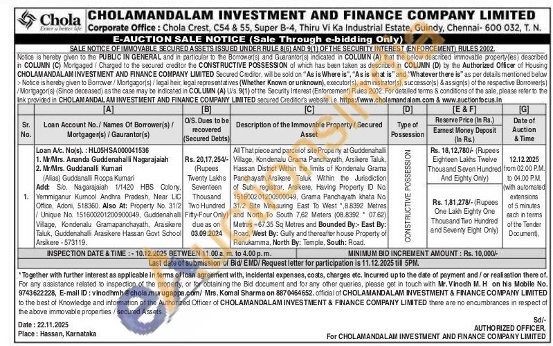 All That piece and parcel of site Property at Guddenahall Village, Kondenalu Grama Panchayath, Arsikere Taluk, Hassan District Within the limits of Kondenalu Grama Panchayath, Arsikere Taluk Within the Jurisdiction of Sub registrar, Arsikere, Having Property ID No. 151600201200900049, Grama Panchayath khata No. 31/2 Site Measuring East To West .8.8392 Metres and North To South 7,62 Meters (08.8392 07.62) Metres =67.35 Sq Metres and Bounded By:- East By: Road, West By: Gully and thereafter house Property of Renukamma, North By: Temple, South: Road.