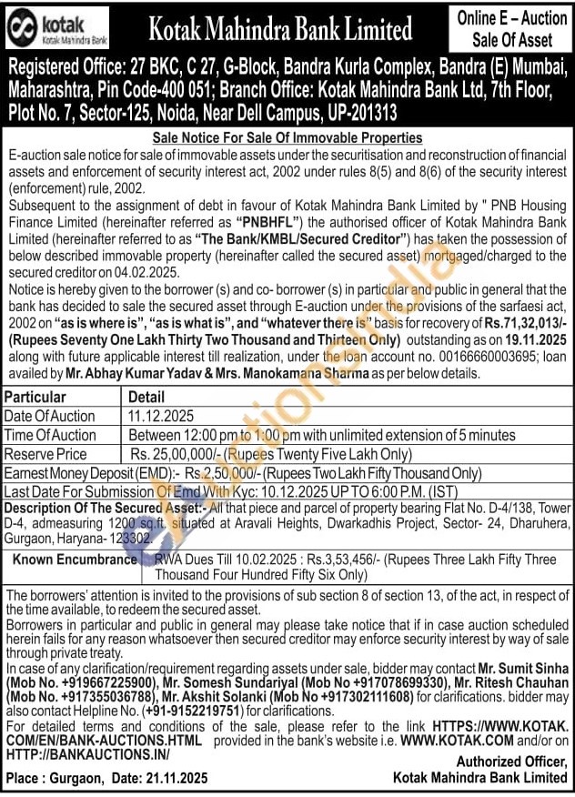 Description Of The Secured Asset:- All that piece and parcel of property bearing Flat No. D-4/138, Tower D-4, admeasuring 1200 sq.ft. situated at Aravali Heights, Dwarkadhis Project, Sector- 24, Dharuhera, Gurgaon, Haryana-123302