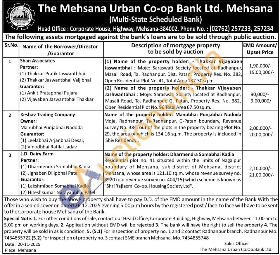 Name of the property holder: Dharmendra Somabhai Kadia Residential plot no. 41 situated within the limits of Nagalpur boundary of Mehsana, sub-district of Mehsana, district Mehsana, whose area is 121.10 sq.m. whose revenue survey no. 8920 (old revenue survey no. 404/15) which scheme is known as "Shri Rajlaxmi Co-op. Housing Society Ltd