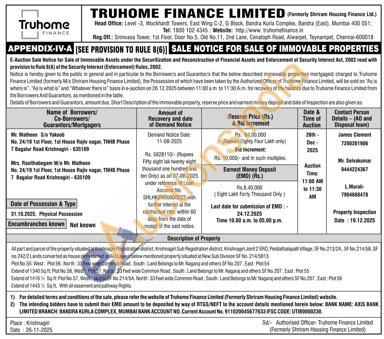 All part and parcel of the property situated at Krishnagiri Registration district, Krishnagiri Sub Registration district, Krishnagiri Joint 2 SRO, Peddathalapalli Village, SF No.213/2A, SF No.214/5B, SF no.242/2 Lands converted as house plots named as MJ Layout below mentioned property situated at New Sub Division SF No. 214/5813 Plot No.55: West: Plot 56, North: 33 Feet wide Common Road, South: Land Belongs to Mr. Nagaraj and others SF No.207, East: Plot 54 Extend of 1340 Sq.ft: Plot No.56, West: Plot 57, North: 33 Feet wide Common Road, South: Land Belongs to Mr. Nagaraj and others SF No.207, East: Plot 55 Extend of 1416½ Sq.ft: Plot No.57, West: land in SF No.214/5A, North: 33 Feet wide Common Road, South: Land Belongs to Mr. Nagaraj and others SF No.207, East: Plot 56 Extend of 1443½ Sq.ft. With all easement and pathway Rights