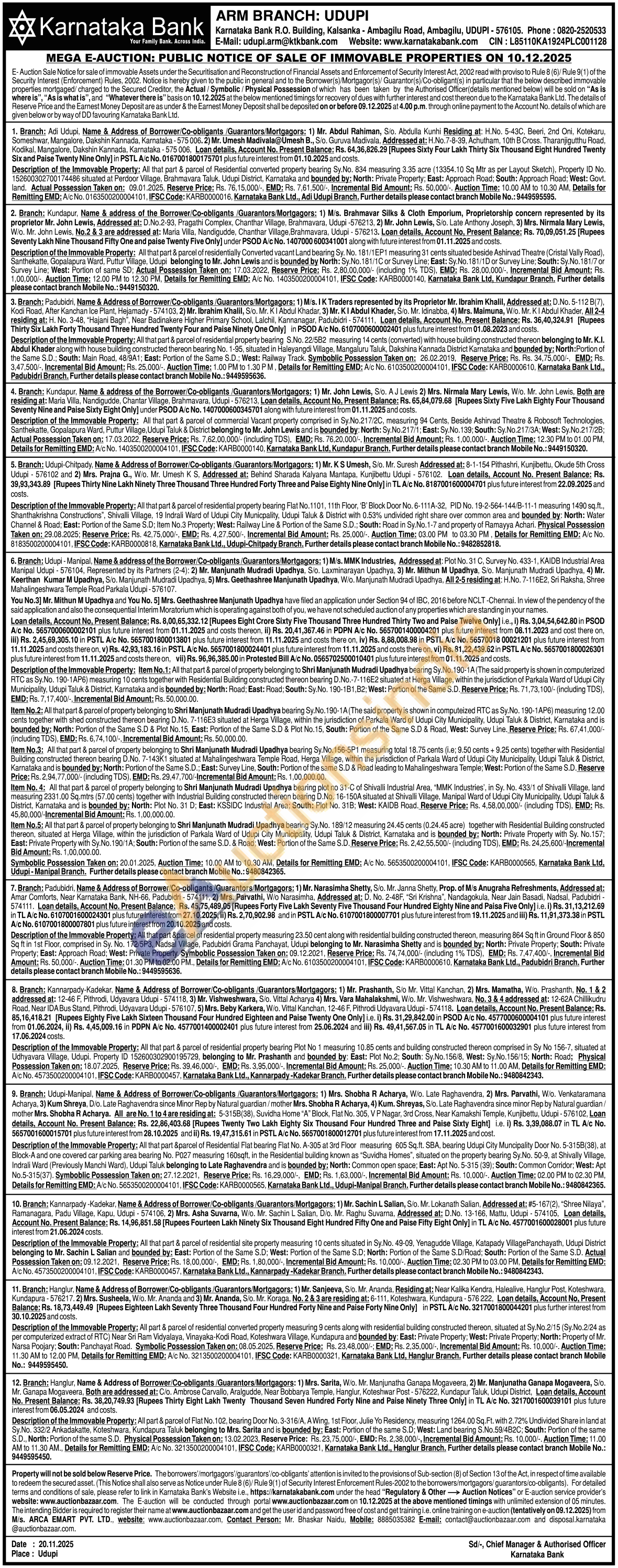 Description of the Immovable Property: All that part & parcel of Residential converted property bearing Sy.No. 834 measuring 3.35 acre (13354.10 Sq Mtr as per Layout Sketch), Property ID No. 152600302700174486 situated at Perdoor Village, Brahmavara Taluk, Udupi District, Karnataka and bounded by: North: Private Property; East: Approach Road; South: Approach Road; West: Govt. land. Actual Possession Taken on: 09.01.2025