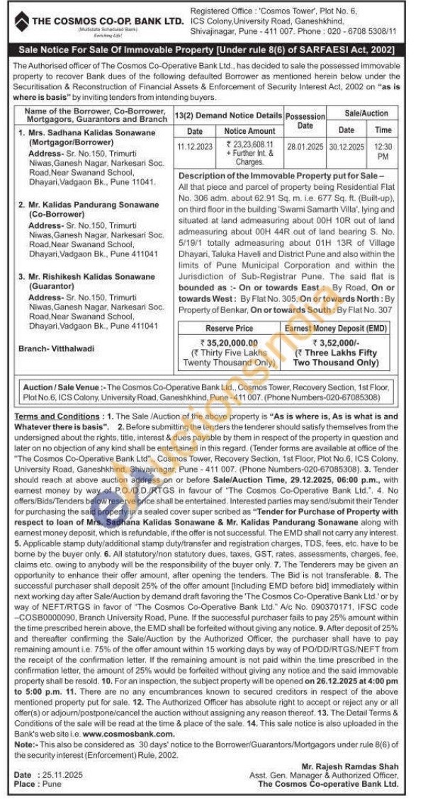 All that piece and parcel of property being Residential Flat No. 306 adm, about 62.91 Sq. m. i.e. 677 Sq. ft. (Built-up), on third floor in the building 'Swami Samarth Villa', lying and situated at land admeasuring about 00H 10R out of land admeasuring about 00H 44R out of land bearing S. No. 5/19/1 totally admeasuring about 01H 13R of Village Dhayari, Taluka Haveli and District Pune and also within the limits of Pune Municipal Corporation and within the Jurisdiction of Sub-Registrar Pune. The said flat is bounded as: On or towards East: By Road, On or towards West: By Flat No. 305, On or towards North: By Property of Benkar, On or towards South: By Flat No. 307