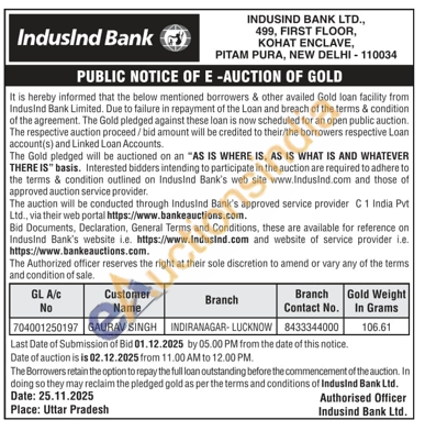 IndusInd Bank Gold Auctions Auction in Lucknow