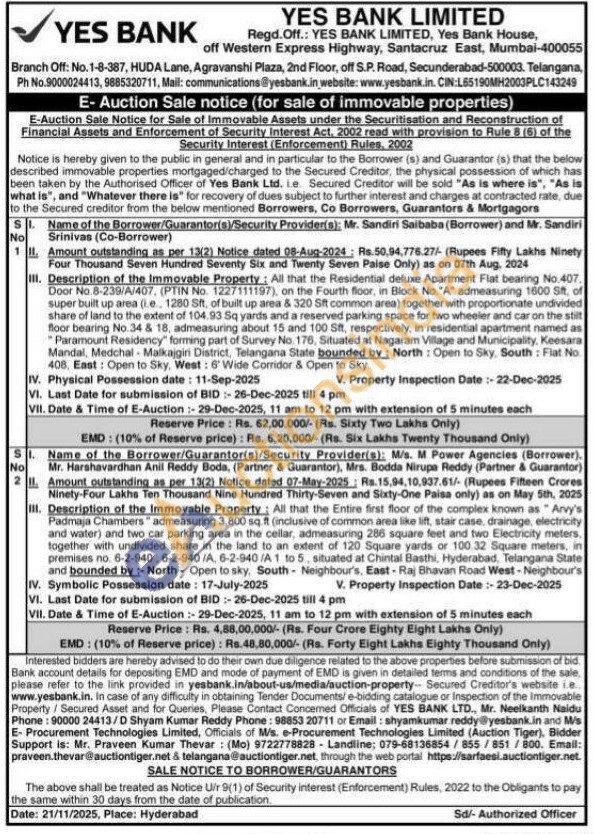 Description of the Immovable Property: All that the Entire first floor of the complex known as "Arvy's Padmaja Chambers" admeasuring 3,800 sq ft (inclusive of common area like lift, stair case, drainage, electricity and water) and two car parking area in the cellar, admeasuring 286 square feet and two Electricity meters, together with undivided share in the land to an extent of 120 Square yards or 100.32 Square meters, in premises no. 6-2-940, 6-2-940/A, 6-2-940/A1 to 5, situated at Chintal Basthi, Hyderabad, Telangana State and bounded by: North Open to sky, South Neighbour's, East-Raj Bhavan Road West-Neighbour's