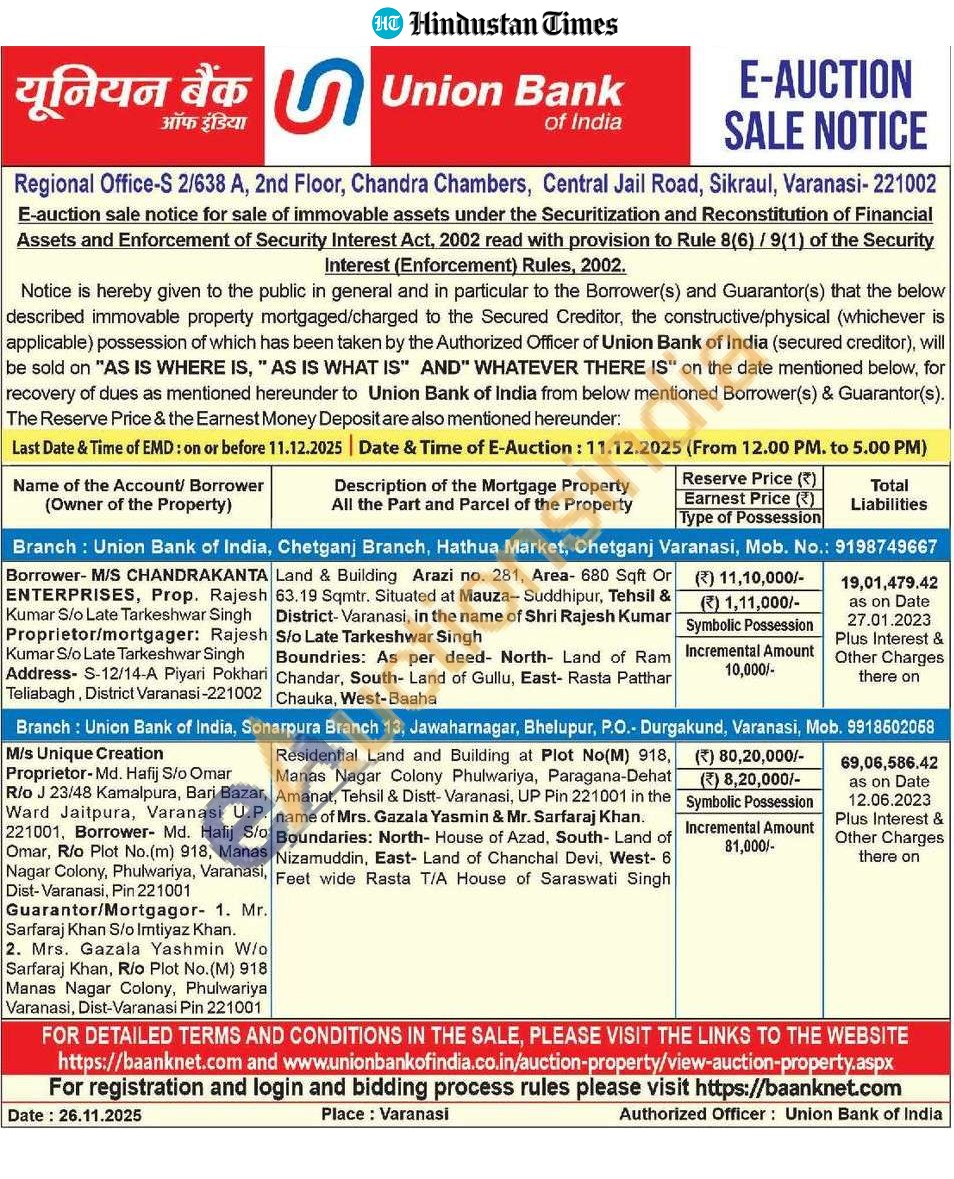 Residential Land and Building at Plot No(M) 918, Manas Nagar Colony Phulwariya, Paragana-Dehat Amanat, Tehsil & Distt- Varanasi, UP Pin 221001 in the name of Mrs. Gazala Yasmin & Mr. Sarfaraj Khan. Boundaries: North- House of Azad, South- Land of Nizamuddin, East- Land of Chanchal Devi, West-6 Feet wide Rasta T/A House of Saraswati Singh