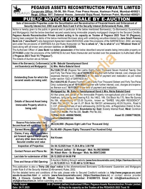 All that piece and parcel of the immovable Property non-agricultural plot of land in Moje Haldharu, lying being land bearing R.S. No. 146/2, 149, Old Block No.170, New Re-Survey No. 184, ad measuring 37723.00 Sq.mtrs., known as "SHREE VALLABH RESIDENCY", Paikki Plot No.331, As per K.J.P. Block No. 184/331 admeasuring 40.26 Sq.mtrs., Road & C.O.P. Undivided Share of land admeasuring 24.59 Sq.mtrs. at Registration District & Sub-District Kamrej District Surat. Boundaries by: East: Society Internal Road, West: Common Open Plot, North: Plot No.330, South: Plot No.332
