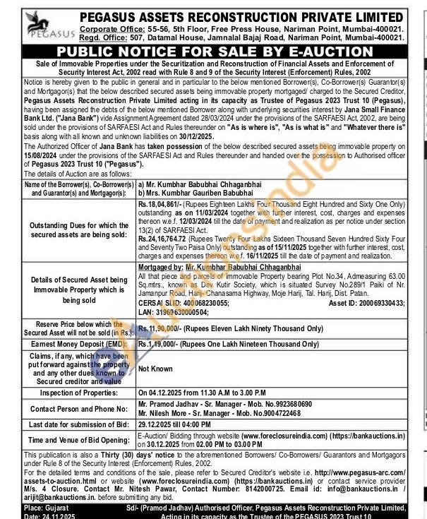 All that piece and parcels of Immovable Property bearing Plot No.34, Admeasuring 63.00 Sq.mtrs., known as Dev Kutir Society, which is situated Survey No.289/1 Paiki of Nr. Jamanpur Road, Harij- Chanasama Highway, Moje Harij, Tal. Harij, Dist. Patan.