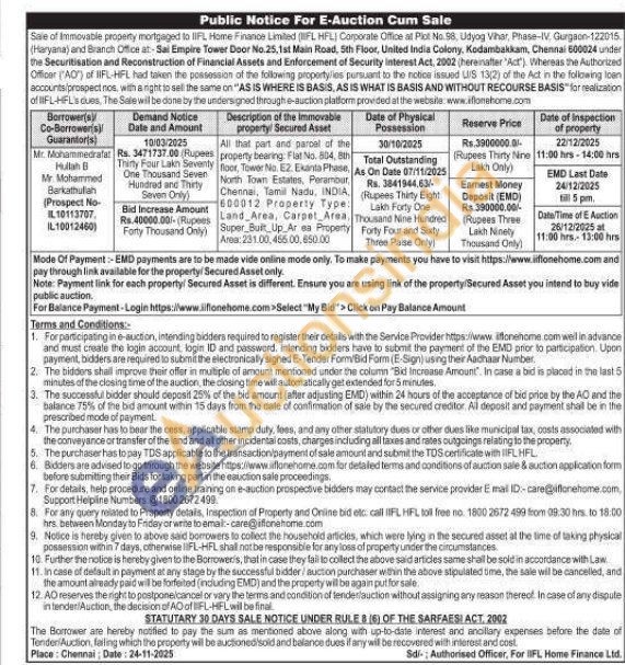 All that part and parcel of the property bearing: Flat No. 804, 8th Roor Noor, Tower No. E2 Ekanta Phase. North Town Estates, Perambur, Chennai, Tamil Nadu, INDIA, 600012 Property Type: Land Area, Carpet Area, Super Built Up Area Property Area: 231.00,455.00,650.00