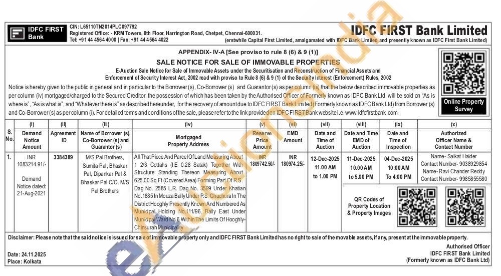 All That Piece And Parcel Of Land Measuring About 1 2/3 Cottahs (I.E 0.28 Satak) Together With Structure Standing Thereon Measuring About 625.00 Sq.Ft (Covered Area) Forming Part Of R.S. Dag No. 2585 L.R. Dag No. 3599 Under Khatian No. 1885 In Mouza Bally Under P.S. Chuchura In The District Hooghly Presently Known And Numbered As Municipal Holding No.111/96, Bally East Under Municipal Ward No.6 Within The Limits Of Hooghly-Chinsurah Municipality