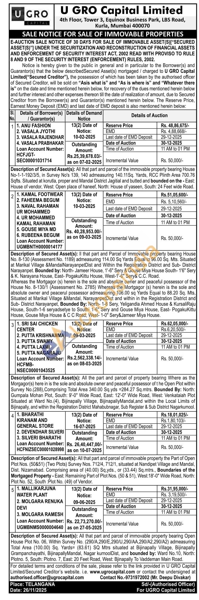 Description of Secured Asset(s): All that part and parcel of the immovable property bearing House No-1-1-192/3/5, in Survey No's 139, 140 admeasuring 140.11Sq. Yards, RCC Plinth Area 700.76 Sqfts. Situated at korutla, proper and Mandal District Jagitial and butted and bounded on the - East: House of vendor, West: Open place of haneef, North: House of yaseen, South: 24 Feet wide Road