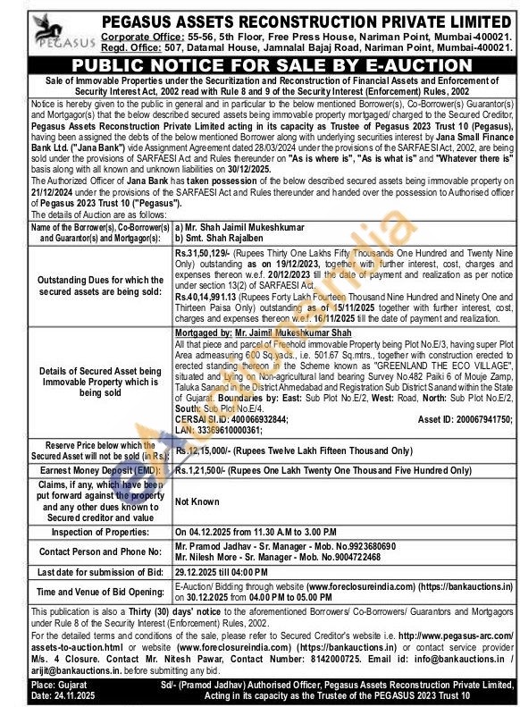 All that piece and parcel of Freehold immovable Property being Plot No.E/3, having super Plot Area admeasuring 600 Sq.yads., ie. 501.67 Sq.mtrs., together with construction erected to erected standing thereon in the Scheme known as "GREENLAND THE ECO VILLAGE", situated and Lying on Non-agricultural land bearing Survey No.482 Paiki 6 of Mouje Zamp, Taluka Sanand in the District Ahmedabad and Registration Sub District Sanand within the State of Gujarat. Boundaries by: East: Sub Plot No.E/2, West: Road, North: Sub Plot No.E/2, South: Sub Plot No.E/4