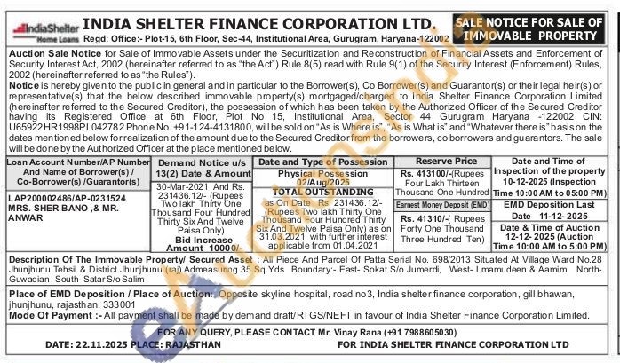 Description Of The Immovable Property/ Secured Asset: All Piece And Parcel Of Patta Serial No. 698/2013 Situated At Village Ward No.28 Jhunjhunu Tehsil & District Jhunjhunu (raj) Admeasuring 35 Sq Yds Boundary:- East- Sokat S/o Jumerdi, West- Lmamudeen & Aamim, North-Guwadian, South-Satar S/o Salim