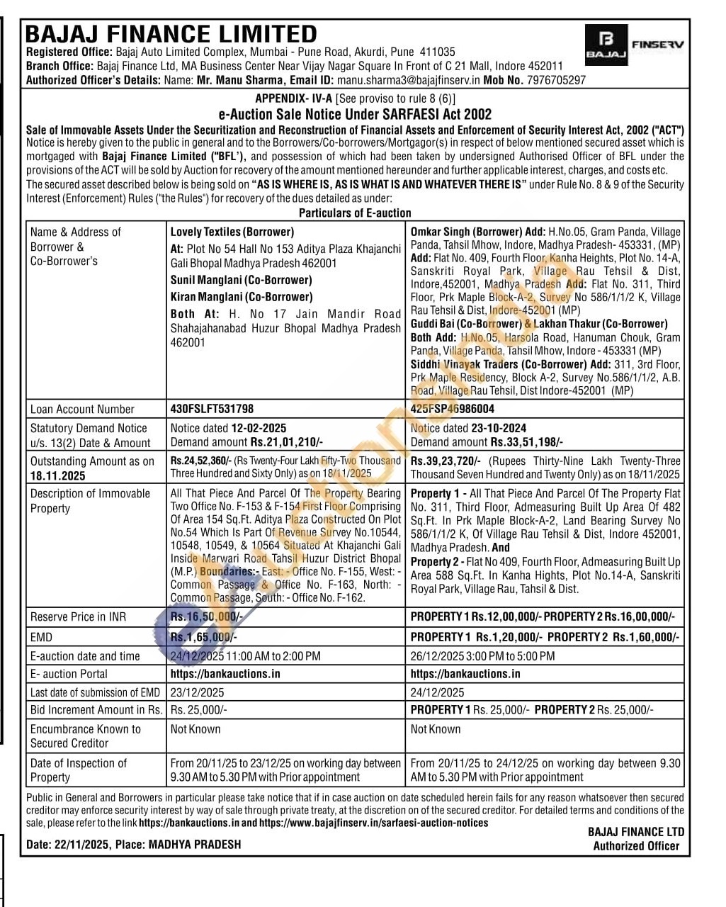 Authorized Officer's Details: Name: Mr. Manu Sharma Mob No. 7976705297