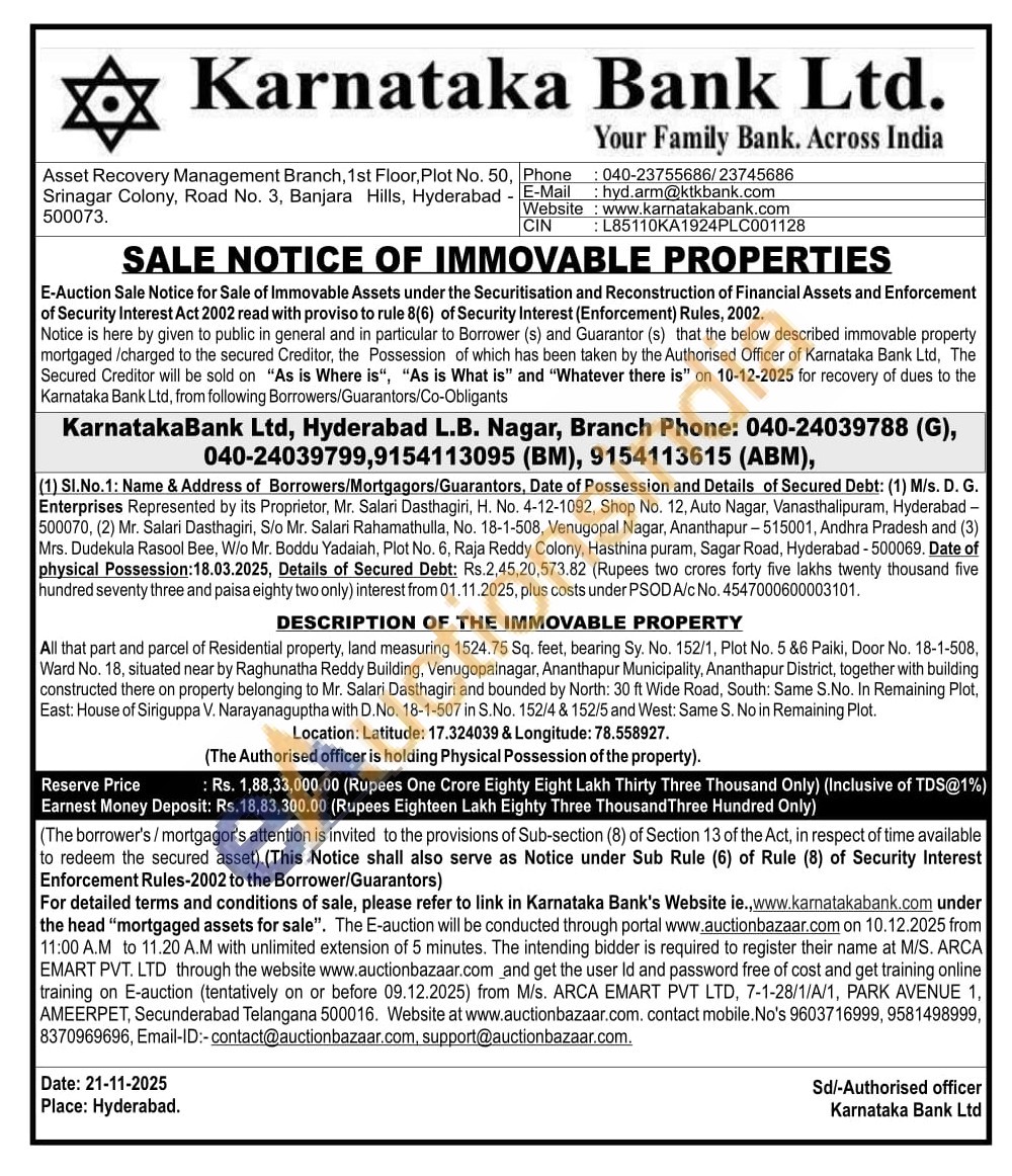 All that part and parcel of Residential property, land measuring 1524.75 Sq. feet, bearing Sy. No. 152/1, Plot No. 5 &6 Paiki, Door No. 18-1-508, Ward No. 18, situated near by Raghunatha Reddy Building, Venugopalnagar, Ananthapur Municipality, Ananthapur District, together with building constructed there on property belonging to Mr. Salari Dasthagiri and bounded by North: 30 ft Wide Road, South: Same S.No. In Remaining Plot, East: House of Siriguppa V. Narayanaguptha with D.No. 18-1-507 in S.No. 152/4 & 152/5 and West: Same S. No in Remaining Plot.