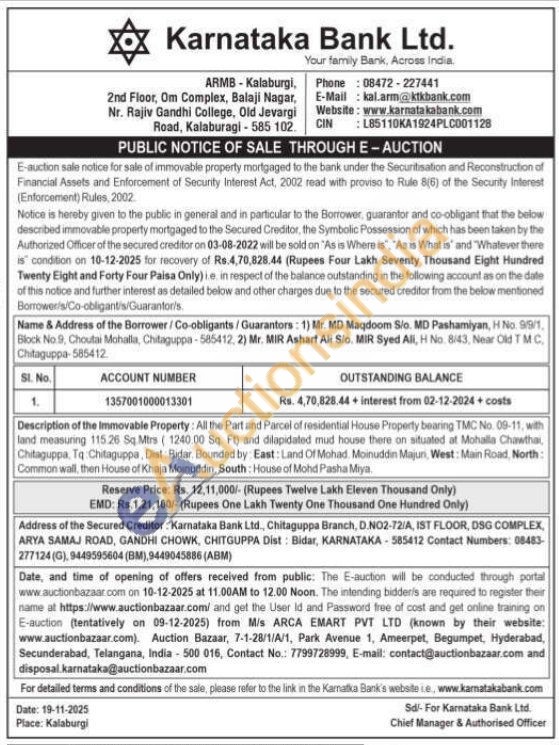 Description of the Immovable Property: All the Part and Parcel of residential House Property bearing TMC No. 09-11, with land measuring 115.26 Sq. Mtrs (1240.00 Sq. Ft) and dilapidated mud house there on situated at Mohalla Chastha, Chitaguppa, Tq Chitaguppa, Dist Bidar Bounded by East: Land Of Mohad Moinuddin Majun, West: Main Road, North: Common wall, then House of Khaja Moinuddin, South: House of Mohd Pasha Miya