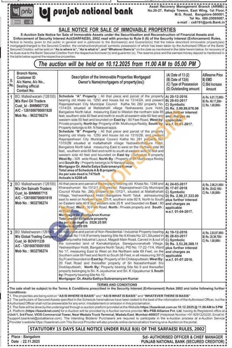 All that piece and parcel of Non-Residential/Industrial Property bearing Municipal No 11/4 (Formerly bearing Site No 9. Khata No 321, Situated in Sri Manjunatha Industrial Layout, Magadi Main Road. Carved in & out of the converted land of Kamakshipalya, Saneguruvanahalli Village. Yeshwanthpur Hobli, Bangalore North Taluk), PID No. 17-22-11/4, Ward No 17, measuring East to West on the Northern side 69 Feet, on the Southern side 66 Feet and North to South 58 Feet, in all measuring 3915 Sq Ftand bounded on East by: Property of Sri Chikkaputtaiah; West By: 20 Feet Road and thereafter property of Sri Narashimhaiah Sio Doddaputtaiah; North By: Property bearing Site No 9 and thereafter property belonging to Sri. K Jayakumar and Sri. K Vijayakumar & South by: Property bearing Site No 10. Mortgagor: Dr. Akella Sathya Subramanyam Kumar