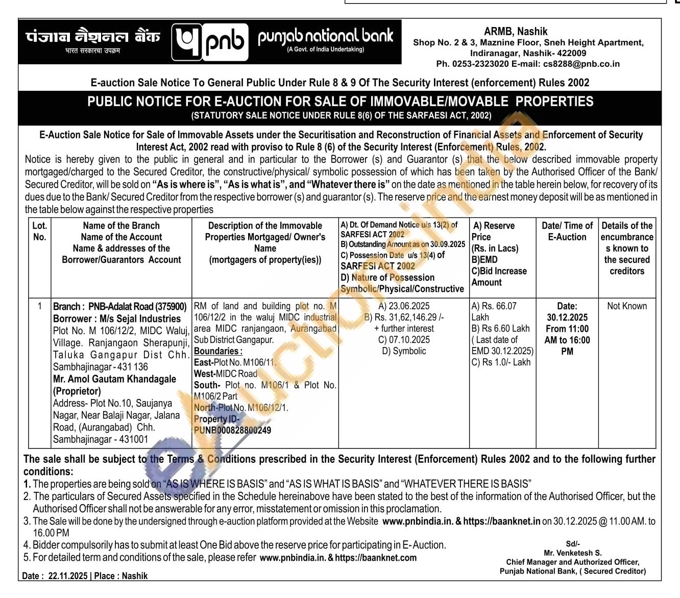 RM of land and building plot no. M 106/12/2 in the waluj MIDC industrial area MIDC ranjangaon, Aurangabad Sub District Gangapur. Boundaries: East-Plot No. M106/11. West-MIDC Road South Plot no. M106/1 & Plot No. M106/2 Part North-Plot No. M106/12/1. Property ID- PUNB000828800249
