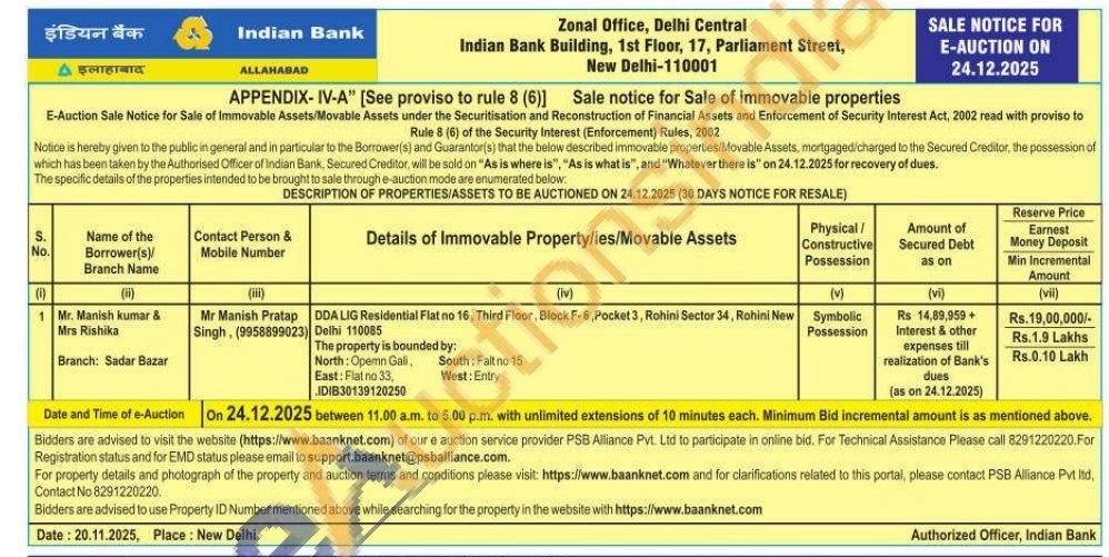 DDA LIG Residential Flat no 16, Third Floor, Block F-6, Pocket 3, Rohini Sector 34, Rohini New ) Delhi 110085 The property is bounded by: North: Opemn Gall, South: Falt no 15 East: Flat no 33, West: Entry
