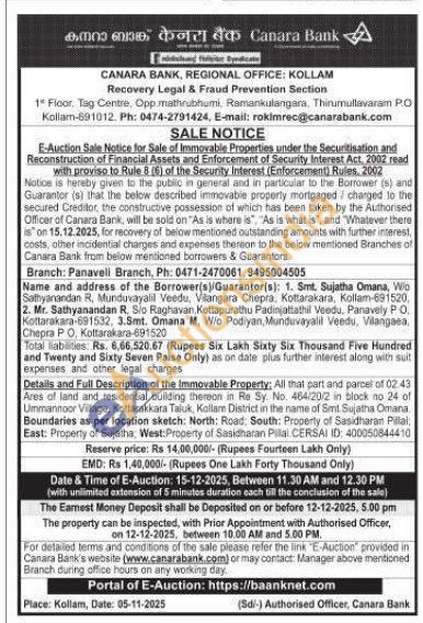 All that part and parcel of 02.43 Ares of land and residential building thereon in Re Sy. No. 464/20/2 in block no 24 of Ummannoor Village, Kottarakkara Taluk, Kollam District in the name of Sint Sujatha Omana Boundaries as per location sketch: North: Road, South: Properly of Sasidharan Pillal: East: Property of Sujatha, West: Property of Sasidharan Pillai. CERSAI ID: 400050844410