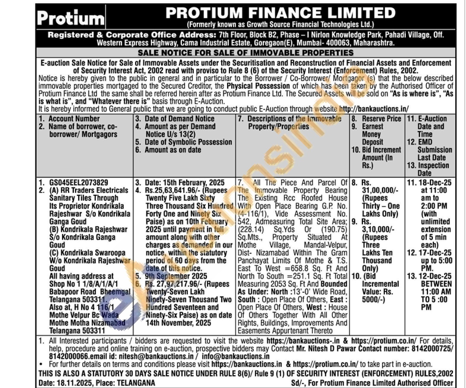 All The Piece And Parcel Of The Immovable Property Bearing The Existing Rcc Roofed House With Open Place Bearing G.P. No. (4-116/1), Vide Assessment No. 542, Admeasuring Total Site Area; (228.14) Sq.Yds Or (190.75) Sq.Mts., Property Situated At Mothe Village, Mandal-Velpur, Dist- Nizamabad Within The Gram Panchayat Limits Of Mothe & T.S. East To West 658.8 Sq. Ft And North To South =251.1 Sq. Ft Total Measuring 2053 Sq. Ft And Bounded As Under: North: 13'-0' Wide Road, South: Open Place Of Others, East: Open Place Of Others, West: House Of Others Together With All Other Rights, Buildings, Improvements And Easements Appurtenant Thereto