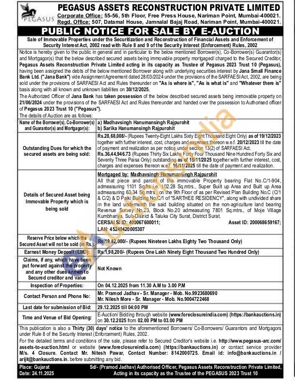 All that piece and parcel of the immovable Property bearing Flat No.C/1-904, admeasuring 1101 Sq.fts l.e. 102.28 Sq.mtrs., Super Built up Area and Built up Area admeasuring 63.34 Sq.mtrs., on the 9th Floor of as per Revised Plan Building No.C (C/1 & C/2) & D Paiki Building No.C/1 of "SARTHEE RESIDENCY", along with undivided share in the land underneath the said building situated on the non-agriculture land bearing Revenue Survey No.23, Block No.20 admeasuring 7801 Sq.mtrs., of Moje Village. Kumbhariya, Sub-District & Taluka City Surat, District Surat