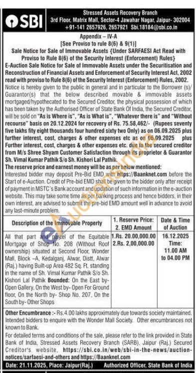 All that part and parcel of the Equitable Mortgage of Shop No. 208 (Without Roof ownership) situated at Second Floor, Wonder Mall, Block-A, Kedalganj, Alwar, Distt, Alwar (Raj.) having Built-up Area 482 Sq. Ft. standing in the name of Sh. Vimal Kumar Pathik S/o Sh. Kishori Lal Pathik