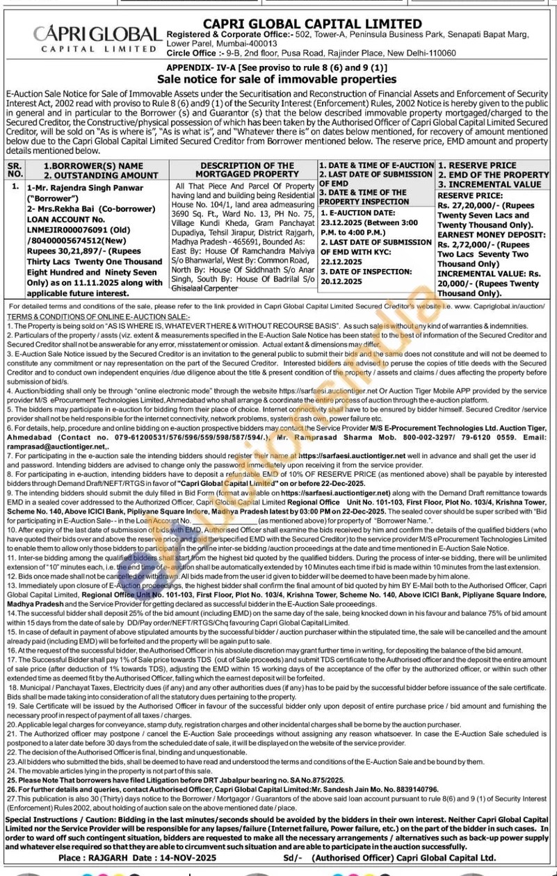 All That Piece And Parcel Of Property having land and building being Residential House No. 104/1, land area admeasuring 3690 Sq. Ft., Ward No. 13, PH No. 75, 75, Village Kundi Kheda, Gram Panchayat Dupadiya, Tehsil Jirapur, District Rajgarh, Madhya Pradesh-465691, Bounded As: East By: House Of Ramchandra Malviya S/o Bhanwarlal, West By: Common Road, North By: House Of Siddhnath S/o Anar Singh, South By: House Of Badrilal S/o Ghisalaal Carpenter