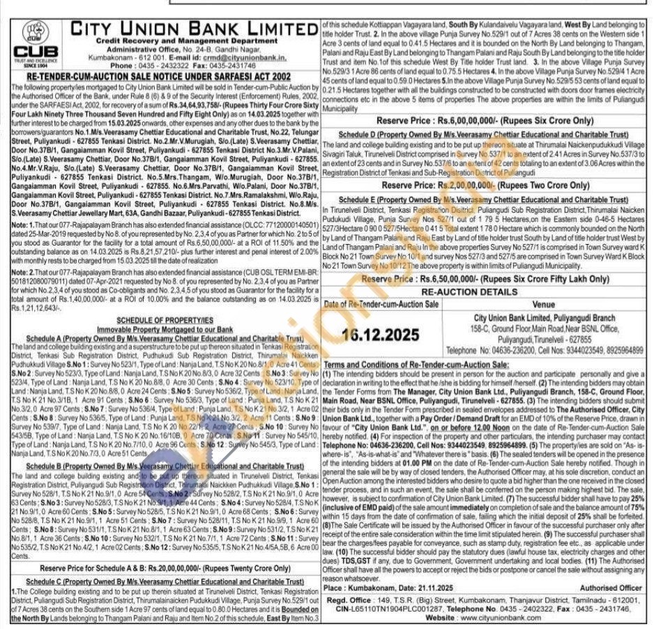 The land and college building existing and a superstructure to be put up thereon situated in Tenkasi Registration District, Tenkasi Sub Registration District, Pudhukudi Sub Registration District, Thirumalai Naickken Pudhukkudi Village S.No 1: Survey No 523/1, Type of Land: Nanja Land, T.S No K20 No.8/1,0 Acre 41 Cents. S.No 2: Survey No 523/3, Type of Land: Nanja Land, T.S No K20 No.8/3, 0 Acre 32 Cents, S.No 3: Survey No 523/4, Type of Land: Nanja Land, T.S No K 20 No.8/8, 0 Acre 30 Cents: S.No 4: Survey No 523/10, Type of Land: Nanja Land, TS No K 20 No 8/8, 0 Acre 24 Cents: S.No 5: Survey No 536/2, Type of Land: Nanja Land, TS No K 21 No. 3/18, 1 Acre 91 Cents: S.No 6 Survey No 536/3, Type of Land: Punja Land, T.S No K.21 No.3/2,0 Acre 97 Cents, S.No 7: Survey No 536/4, Type of Land: Punja Land, T.S No K21 No 3/2, 1 Acre 02 Cents: S.No 8: Survey No 536/5, Type of Land: Punja Land, T.S No K 21 No. 3/2, 2 Acre 11 Cents. S.No 9. Survey No 539/7, Type of Land: Nanja Land, T.S No K 20 No.22/1, 2 Acre 27 Cents: S.No 10: Survey No 543/5B, Type of Land: Nanja Land, T.S No K 20 No. 16/10B, 0 Acre 70 Cents: S.No 11: Survey No 545/10, Type of Land: Nanja Land, T.S No K 20 No.7/10.0 Acre 96 Cents; S.No 12: Survey No 545/3, Type of Land: Nanja Land, T.S No K20 No.7/3,0 Acre 51 Cents.