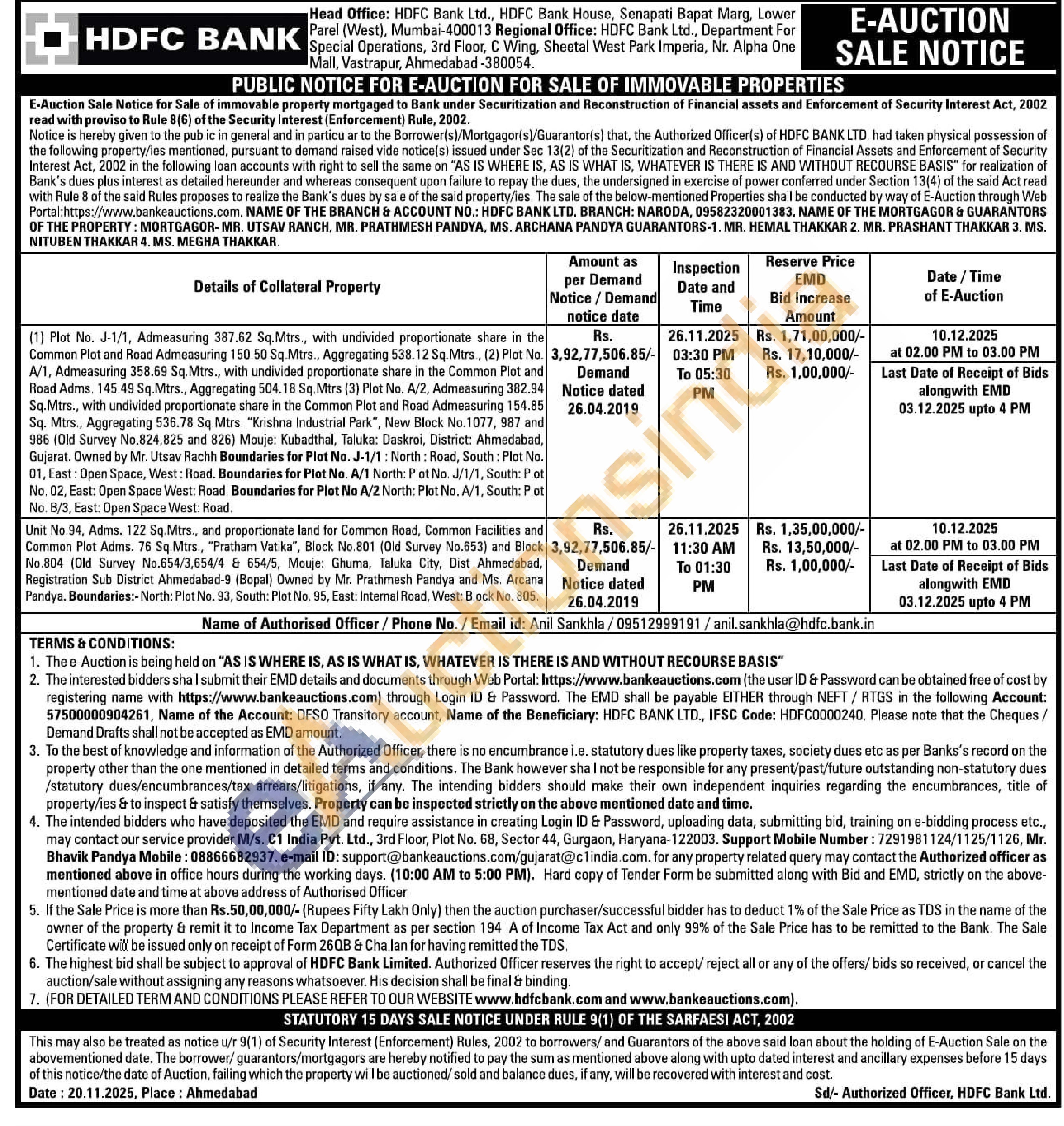 Unit No.94, Adms. 122 Sq.Mtrs., and proportionate land for Common Road, Common Facilities and Common Plot Adms. 76 Sq.Mtrs., "Pratham Vatika", Block No.801 (Oid Survey No.653) and Block No.804 (Old Survey No.654/3,654/4 & 654/5, Mouje: Ghuma, Taluka City, Dist Ahmedabad, Registration Sub District Ahmedabad-9 (Bopal) Owned by Mr. Prathmesh Pandya and Ms. Arcana Pandya. Boundaries:-North: Plot No. 93, South: Plot No. 95, East: Internal Road, West: Block No. 805.