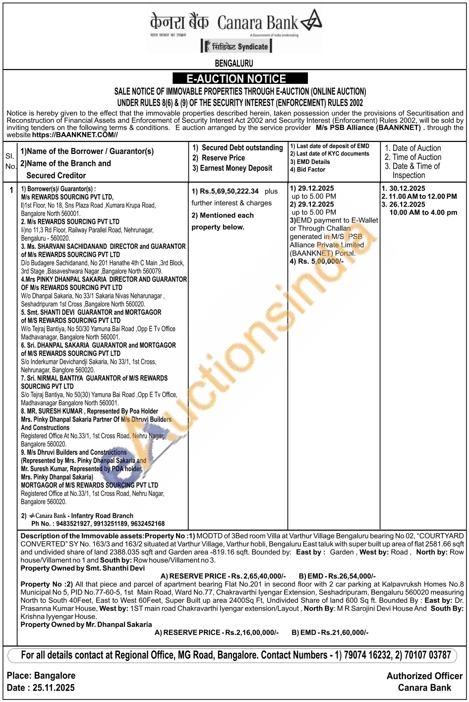 Description of the Immovable assets: Property No: 1) MODTD of 3Bed room Villa at Varthur Village Bengaluru bearing No 02, "COURTYARD CONVERTED SY No. 163/3 and 163/2 situated at Varthur Village, Varthur hobli, Bengaluru East taluk with super built up area of flat 2581.66 sqft and undivided share of land 2388.035 sqft and Garden area -819.16 sqft. Bounded by: East by: Garden, West by: Road, North by: Row house/Villament no 1 and South by: Row house/Villament no 3. Property Owned by Smt. Shanthi Devi
