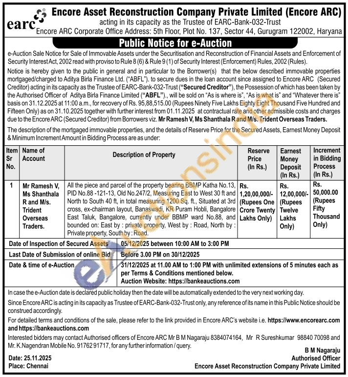 All the piece and parcel of the property bearing BBMP Katha No.13, PID No.88-121-13, Old No.247/2, Measuring East to West 30 ft and North to South 40 ft, in total measuring 1200 Sq. ft., Situated at 3rd cross, ex-chairman layout, Banaswadi, KR Puram Hobli, Bangalore East Taluk, Bangalore, currently under BBMP ward No.88, and bounded on: East by: private property, West by: Road, North by: Private property, South by: Road.