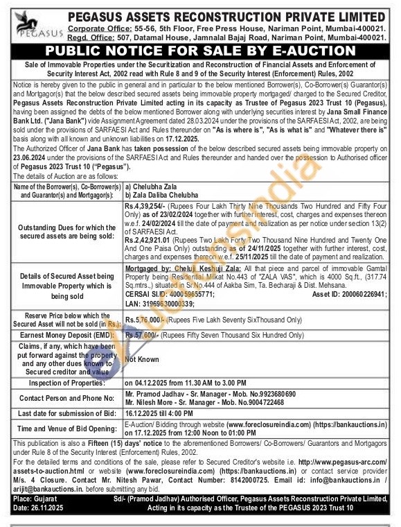 Mortgaged by: Cheluji Keshuji Zala: All that piece and parcel of immovable Gamtal Property being Residential Milkat No.443 of "ZALA VAS", which is 4000 Sq.ft., (317.74 Sq.mtrs.,) situated in Sr.No.444 of Aakba Sim, Ta. Becharaji & Dist. Mehsana. CERSAI SI.ID: 400059655771