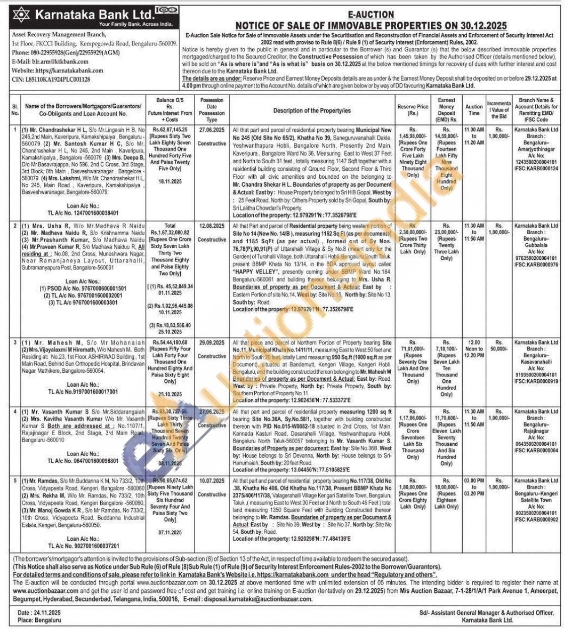 5) All that part and parcel of residential property bearing No. 117/38, Old No 38, Khatha No 406, Old Khatha No.117/38, Present BBMP Khata No 2375/406/117/38, Valagerahalli Village Kangari Satellite Town, Bengaluru Taluk (measuring East to West 30 Feet and North to South 45 Feet) total land measuring 1350 Square Fent with Building Constructed thermon belonging to Mr. Ramdas. Boundaries of property as per Document & Actual East by: Site No 39. West by: Site No 37, North by: Site No 54, South by: Road