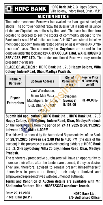 Vani Warehouse, Gram Mali Vada Matlabpura Teh Dhar, Dist. Dhar-454001 (Μ.Ρ.)