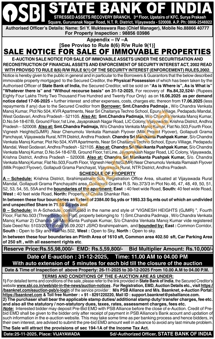 A-Schedule: Krishna District, Ibrahimpatnam Sub Registration Office Area, situated at Vijayawada Rural Mandal, Gollapudi Grama Panchayathi area, Gollapudi Grama R.S. No.373/3 in Plot No.46, 47, 48, 49, 50, 51, 52, 53, 54, 55, 55A and the boundaries of the apartment: East: 40 feet wide Road, South: 40 feet wide Road, West: 40 feet wide Road, North: Property of Challa Shankar Rao. In between these four boundaries an Extent of 2384.00 Sq.yds or 1993.33 Sq.mts out of which an undivided and unspecified Share in 71.58 Sq.yds and B-Schedule: In A-Schedule, constructed in the name and style of "VIGNESH HEIGHTS (GJMR)", Fourth Floor, Flat No.503 (Three Bedroom Flat), property belonging to 1) Smt. Chandra Padmaja, W/o Chandra Venkata Manoj Kumar 2) Chandra Sri Manikanta Pushpak Kumar, S/o Chandra Venkata Manoj Kumar vide registered Sale Deed No: 5103/2021 dated 16.09.2021 JSRO Ibrahimpatnam, and bounded by: East: Common Corridor, South: Open to Sky and Flat No.502, West: Open to Sky, North: Open to sky.