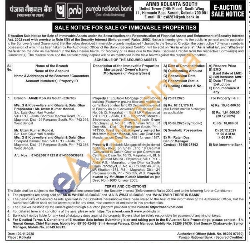 Equitable Mortgage of Two storied building (Factory in ground floor and residence on 1stfloor) onshali land 03 Decimal converted to Factory as per Conversion Certificate Case No. 09/13, Magrahat-II, BL & LRP situated at Vill P.O.Alida, P.S. Magrahat, Mouza-Shyampur, under Dhamua South Gram Panchayet. JL No. 43, RS Khatian 3733, LR Dag 4561, Dist-24 Parganas South, Pin-743355, West Bengal. Property owned by Mr.Uttam Kumar Mondal, S/o. Late Gour Han Mondal as per Deed No. 1-4881 for year 1987