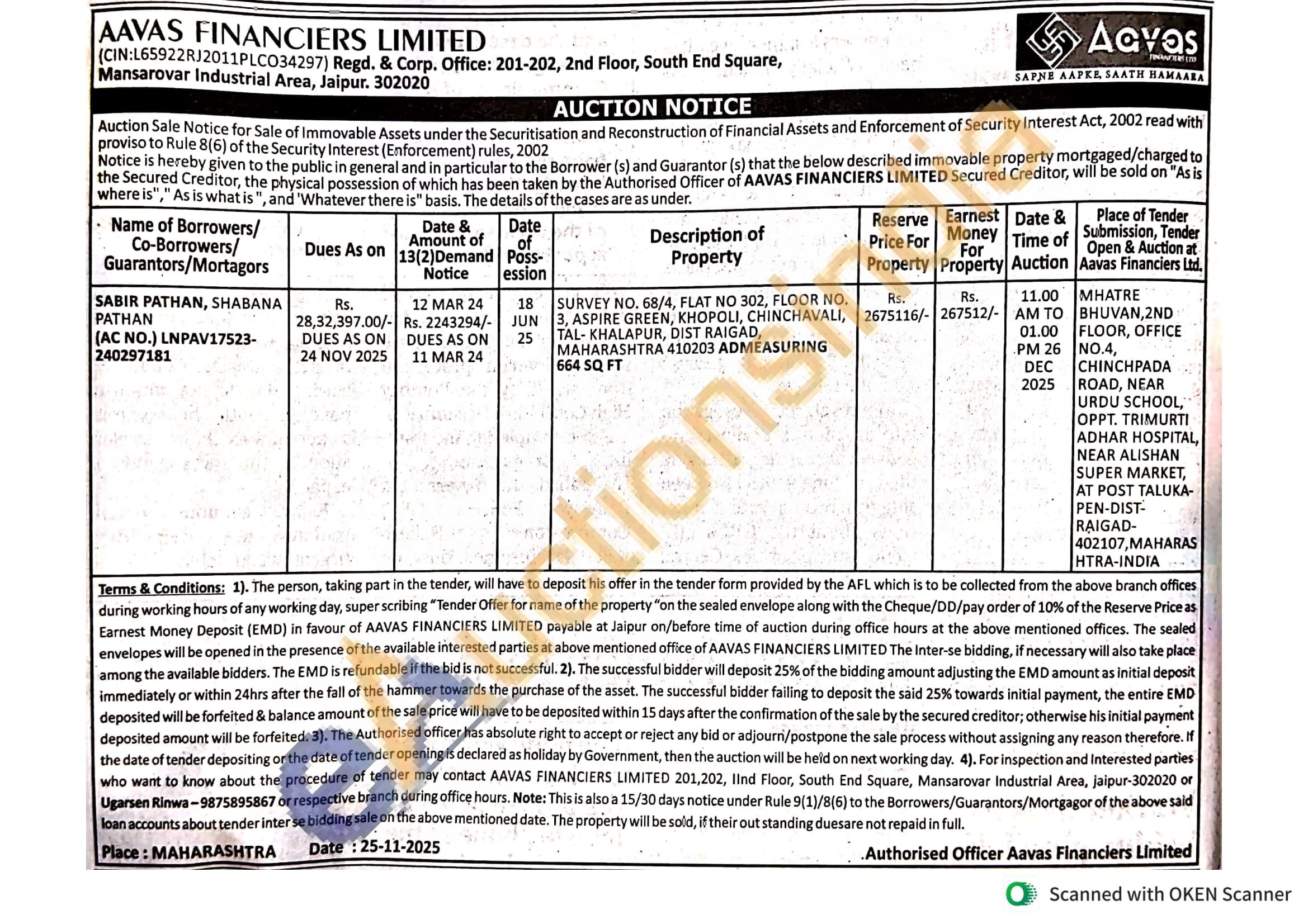 SURVEY NO. 68/4, FLAT NO 302, FLOOR NO. 3, ASPIRE GREEN, KHOPOLI, CHINCHAVALI, TAL-KHALAPUR, DIST RAIGAD, MAHARASHTRA 410203 ADMEASURING 664 SQ FT