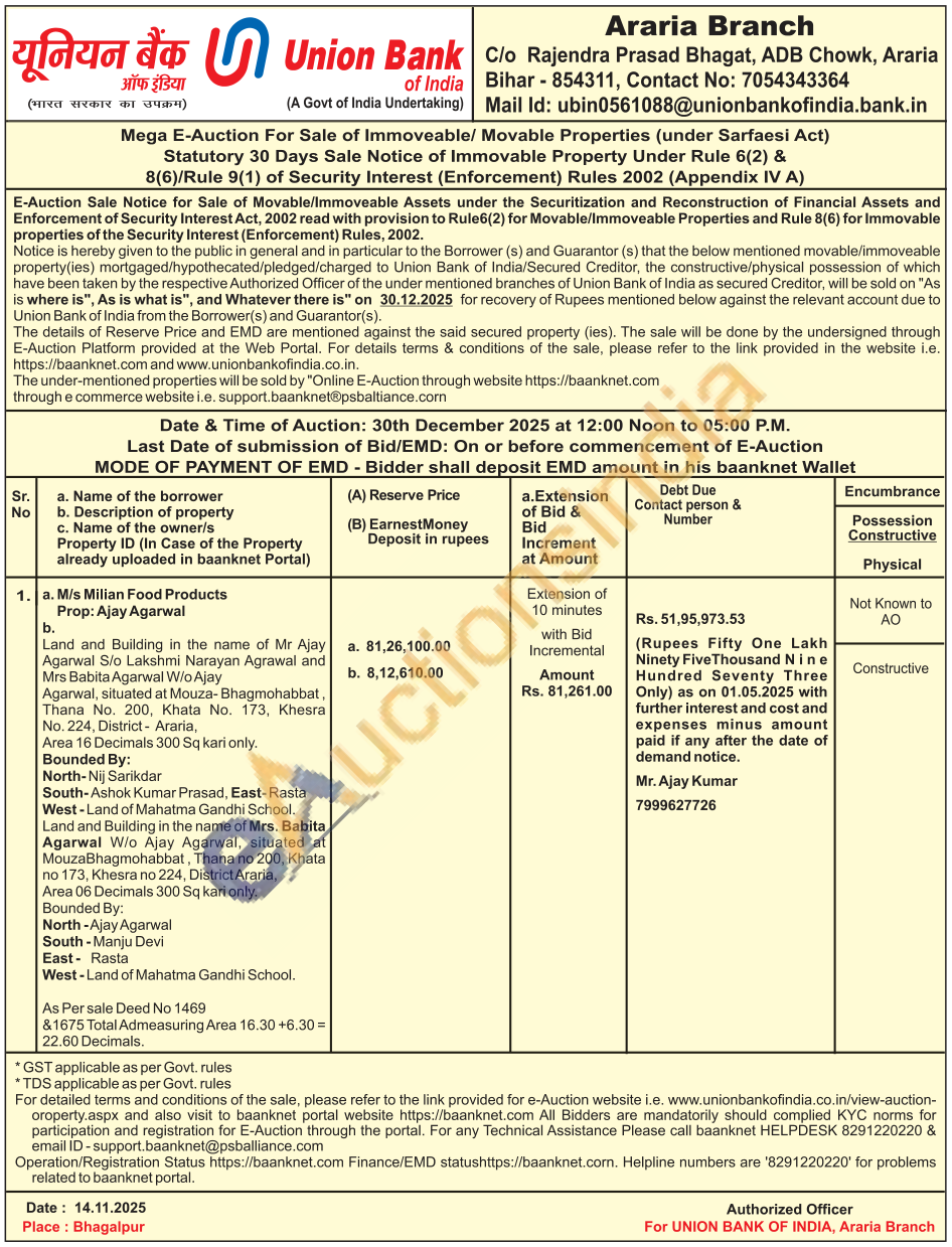 Land and Building in the name of Mr Ajay Agarwal S/o Lakshmi Narayan Agrawal and Mrs Babita Agarwal W/o Ajay Agarwal, situated at Mouza- Bhagmohabbat, Thana No. 200, Khata No. 173, Khesra No. 224, District - Araria, Area 16 Decimals 300 Sq kari only. Bounded By: North-Nij Sarikdar South-Ashok Kumar Prasad, East-Rasta West-Land of Mahatma Gandhi School. Land and Building in the name of Mrs. Babita Agarwal W/o Ajay Agarwal, situated at MouzaBhagmohabbat, Thana no 200, Khata no 173, Khesra no 224, District Araria, Area 06 Decimals 300 Sq kari only. Bounded By: North-Ajay Agarwal South - Manju Devi East- Rasta West-Land of Mahatma Gandhi School. As Per sale Deed No 1469 &1675 Total Admeasuring Area 16.30 +6.30 = 22.60 Decimals.