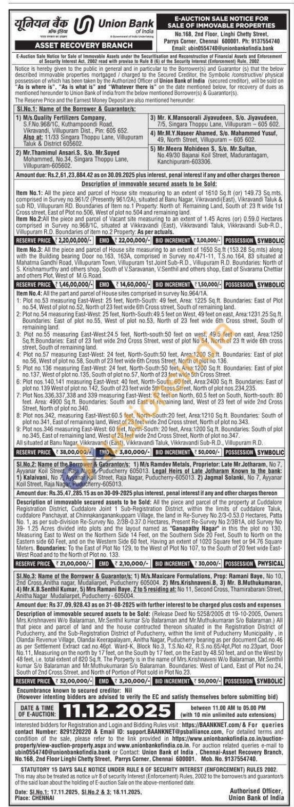 All that piece and parcel of land and the house contructed thereon situated in the Registration District of Puducherry, and the Sub-Registration District of Puducherry, within the limit of Puducherry Municipality, in Olandai Revenue Village, Olandai Keerapalayam, Anitha Nagar, Puducherry bearing as per document Cad.no.46 as per Settlement Extract cad.no.46pt. Ward-K, Block No.3, T.S.No.42, R.S.no.65/4pt, Plot no.23part, Door No.11, Measuring on the north by 17 feet, on the South by 17 feet, on the East by 48.50 feet, and on the West by 48 feet, le. total extent of 820 Sq.ft. The Porperty is in the name of Mrs. Krishnaveni W/o Balaraman, Mr.Senthil kumar S/o Balaraman and Mr.Muthukumaran S/o Balaraman. Boundaries: West of Land, East of Plot no.24, South of 2nd Cross Street, and North of Portion of Plot sold in Plot No.23.