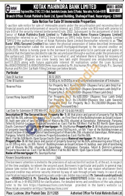 All that piece and parcel of property Flat No.104 and Flat No.105, admeasuring area 134.75 sq.mtr., on First Floor of the Building known as Goyal Enclave-III built over plot of land being part of Khasra No.359 situated at Ganeshpur, Rehmanpur, Pargana, Tehsil & District-Lucknow. Property bounded as: East: Flat No.106 West: Flat No. 103 North: Open space South: Common Passage Name of mortgagor: Mr. Atul Kumar