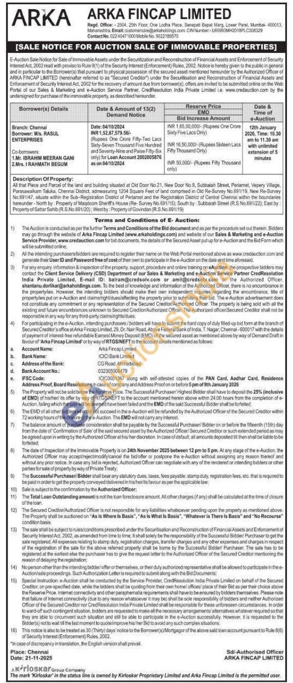 All that Piece and Parcel of the land and building situated at Old Door No.21, New Door No.8, Subbaiah Street, Periamet, Vepery Village, Purasawalkam Taluka, Chennai District, admeasuring 1204 Square Feet of land comprised in Old Re-Survey No.691/19, New Re-Survey No.691/47, situate within the Sub-Registration District of Periamet and the Registration District of Central Cherinal within the boundaries hereunder-North by: Property of Maqdoom Sheriff's House (Re-Survey No.691/15); South by: Subbalah Street (R.S. No.691/22), East by: Property of Sattar Sahib (R.S.No. 691/20); West by: Property of Govindan (R.S.No.691/19)