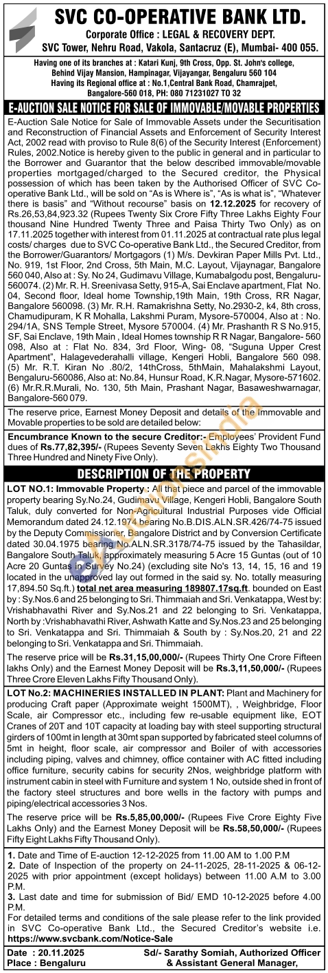 Immovable Property: All that piece and parcel of the immovable property bearing Sy.No.24, Gudimavu Village, Kengeri Hobli, Bangalore South Taluk, duly converted for Non-Agricultural Industrial Purposes vide Official Memorandum dated 24.12.1974 bearing No.B.DIS.ALN.SR.426/74-75 issued by the Deputy Commissioner, Bangalore District and by Conversion Certificate dated 30.04.1975 bearing No.ALN.SR.3178/74-75 issued by the Tahasildar, Bangalore South Taluk, approximately measuring 5 Acre 15 Guntas (out of 10 Acre 20 Guntas in Survey No.24) (excluding site No's 13, 14, 15, 16 and 19 located in the unapproved lay out formed in the said sy. No. totally measuring 17,894.50 Sq.ft.) total net area measuring 189807.17sq.ft. bounded on East by: Sy.Nos.6 and 25 belonging to Sri. Thimmaiah and Sri. Venkatappa, West by: Vrishabhavathi River and Sy.Nos.21 and 22 belonging to Sri. Venkatappa, North by: Vrishabhavathi River, Ashwath Katte and Sy. Nos.23 and 25 belonging to Sri. Venkatappa and Sri. Thimmaiah & South by: Sy.Nos.20, 21 and 22 belonging to Sri. Venkatappa and Sri. Thimmaiah