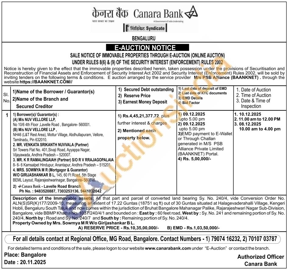 Description of the Immovable assets: All that part and parcel of converted land bearing Sy. No. 240/4, vide Conversion Order No. ALN(S)SR(K)177/2009-10, measuring an extent of 17.22 Guntas (18751 sq ft) out of 30 Guntas situated at Halagevaderahalli Village, Kengeri Hobli, Bengaluru South Taluk and now comes within the jurisdiction of Bruhat Bangalore Mahanagar Palike, Rajarajeshwari Nagar Sub-Division, Bangalore, vide BBMP Khatha No. 1037/240/4/1 and bounded on: East by: 60 feet road, West by: Sy. No. 241 and remaining portion of Sy. No. 240/4, North by: Road and Sy. No. 240/7 and South by: Remaining portion of Sy. No. 240/4.