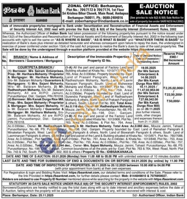 (1-A) All the part and parcel of Factory Land and Building situated at Khata No.: 1013/717, Plot No.: 765, Area: Ac.0.030dec. Property bounded by- East: Land of Prasant Panigrahi, West: Land of Radheshyam Mohanty, North: Land of Laxmi Narayan Panigrahi, South: Land of Maheswar Mohanty and Khata No.: 1013/907, Plot No.: 762. Area: Ac.0.058dec. & Plot No.: 759, Area: Ac.0.030dec. Property bounded by- East: Land of Surendra Panigrahi, West: Land of Radhashyam Mohanty & others, North: Land of Prakash Panigrahi & others, South: Land of Plot No. 800. Total Area: Ac.0.118 dec. Owner-Mr. Radheshyam Mohanty. Mouza: Jamini, Tahasil: Purusottampur, No.-68, PS: Purusottampur, No.-198, Dist. Ganjam, (1-B) All the part and parcel of the Factory Land and Building situated Khata No.: 1013/908, Plot No.: 763, Area: Ac.0.030dec. & Plot No.: 764, Area:Ac.0.030dec., Owner- Mr. Radheshyam Mohanty & Mr. Harihara Mohanty. Total Area: Ac.0.060 dec., Mouza: Jamini, Tahasil: Purusottampur, No.-68, PS: Purusottampur, No.-198, Dist. Ganjam. Property bounded by East: Land of Ramahari Panigrahi & Minaketan Panigrahi, West: Land of Biswanath Panigrahi & others, North: Land of Biswanath Panigrahi & others, South: Land of Laxminaryan Panigrahi & others. (2) All the part and parcel of the Land & Building situated at Khata No.: 1013/871, Plot No.: 760/7088, Area: Ac 0.020dec., Plot No.: 760, Area: Ac.0.010dec., Plot No.: 761, Area: Ac.0.040dec. & Khata No.: 1013/848, Plot No.: 753, Area: Ac.0.055dec., Plot No.: 754, Area: Ac 0.040 dec., Plot No.: 755, Area: Ac.0.039dec., Plot No.: 756, Area: Ac.0.020dec., Plot No.: 757, Area: Ac.0.020dec., Total Area: Ac.0.244 dec., Owner-Mrs. Sajani Mohanty, Mouza: Jamini, Tahasil: Purusottampur, No.-68, PS: Purusottampur, No.-198, Dist. Ganjam. Common boundaries of all the plots are by- East: Plot No. 763 & 764, West: Road, North: Plot No. 743 & 742, South: Plot No. 801, 802, 803 & others/Property ID No.: IDIBSAIKANAKJA