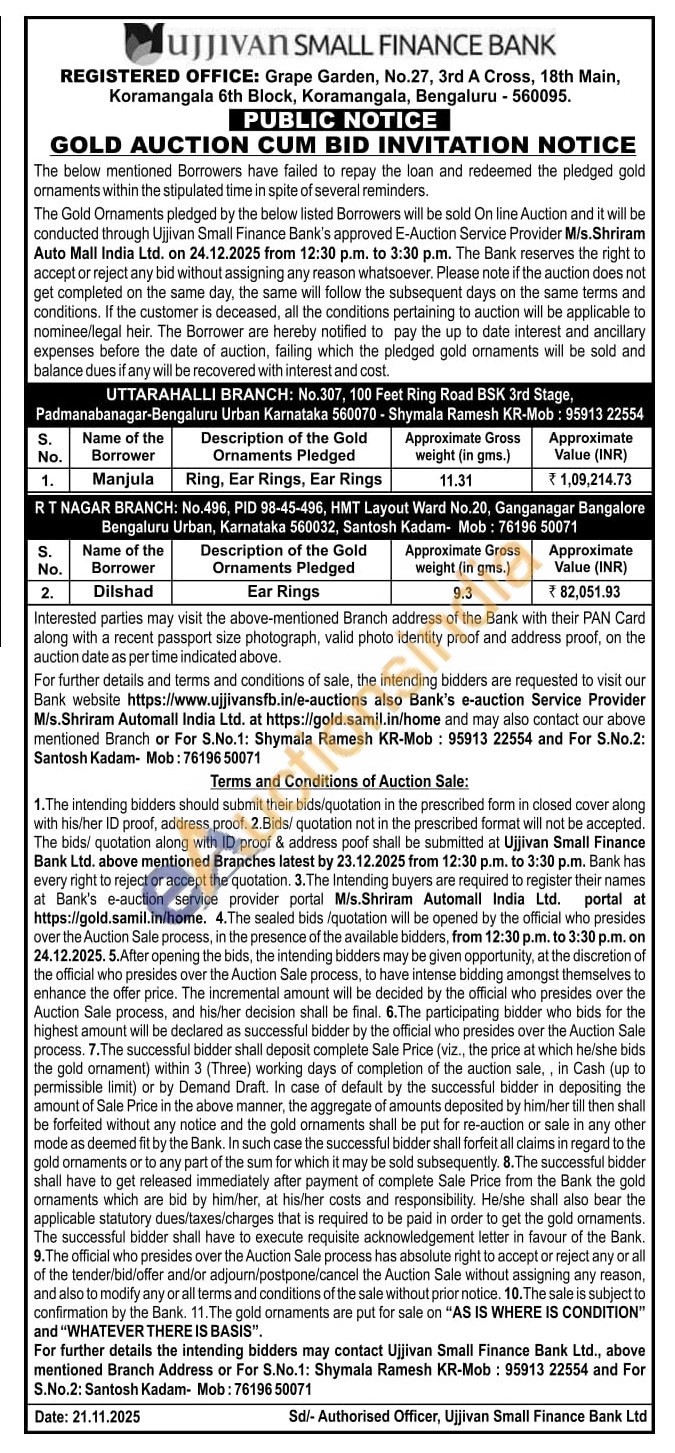 Ujjivan Small Finance Bank Gold Auctions Auction in Bengaluru