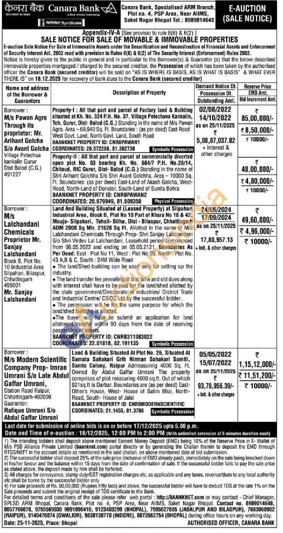 Land And Building Situated at (Leased Property) at Silpahari Industrial Area, Block B, Plot No 10 Part of Khsra No 18 & 42 Mouja- Silpahari, Tehsil-Bilha, Dist-Bilaspur, Chhattisgarh ADM 2000 Sq Mir. 21528 Sq Ft. Allotted in the name of M/s Lalchandani Chemicals Through Prop- Shri Sanjay Lalchandani S/o Stiri Virdev Lal Lalchandani. Leasehold period commenced from 06.05.2022 and ending on 05.05.2121. Boundaries As Per Deed: East: Plot No 11, West: Plot No 09, North: Plot No. 43 A,B & C. South: 24M Wide Road The land/Shed-building can be used only for setting up the industry.The land transfer fee prevailing at that time and old dues along with interest shall have to be paid for the land/shed allotted by the state government/Directorate of industries/ District Trade and Industrial Centre/ CSIDC Ltd by the successful bidder. The permission will be for the same purpose for which the land/shed building is allotted. The buyer will have to submit an application for land allotment/transfer within 90 days from the date of receiving possession of assets.