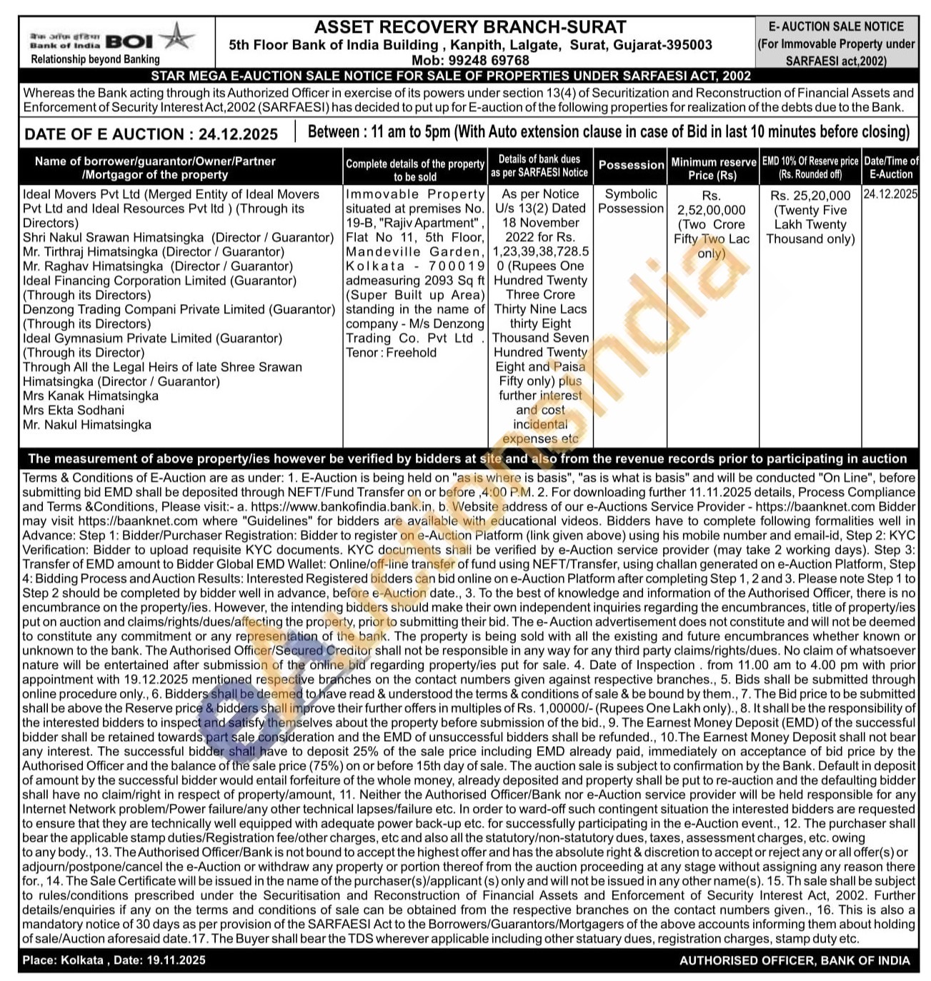 Immovable Property situated at premises No. 19-B, "Rajiv Apartment", Flat No 11, 5th Floor, Mandeville Garden, Kolkata 700019 admeasuring 2093 Sq ft (Super Built up Area) standing in the name of company - M/s Denzong Trading Co. Pvt Ltd Tenor: Freehold